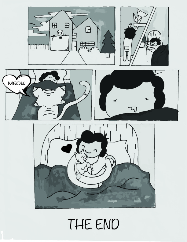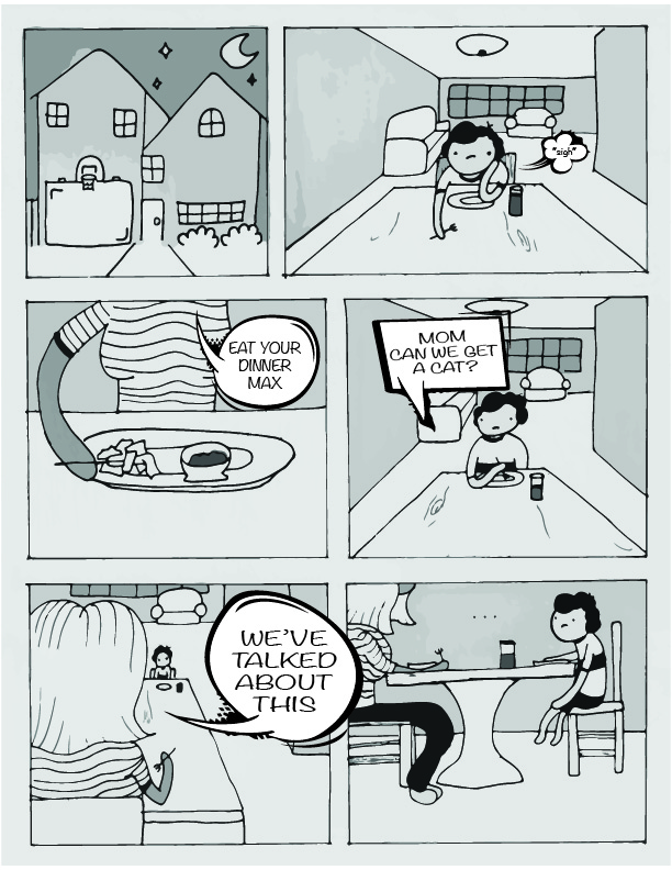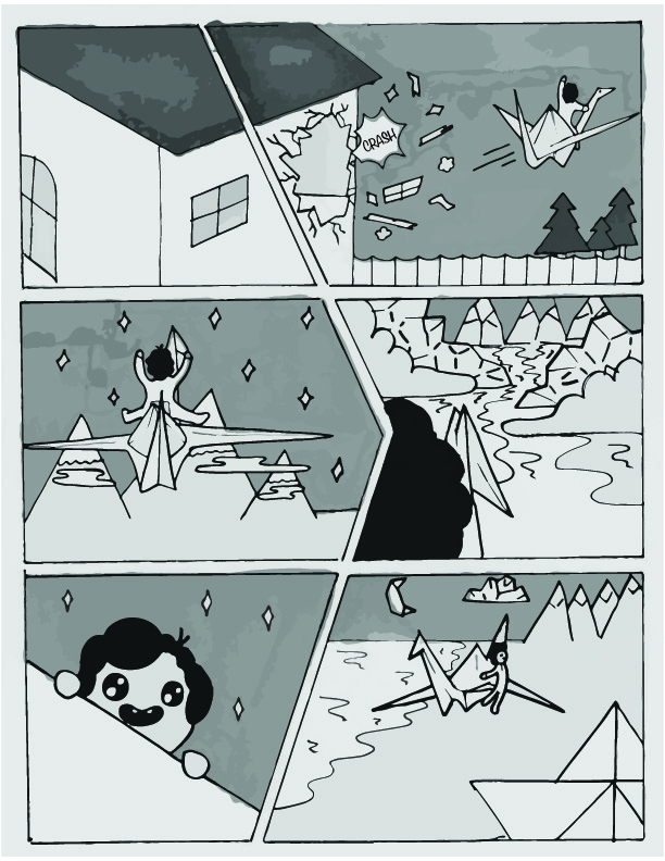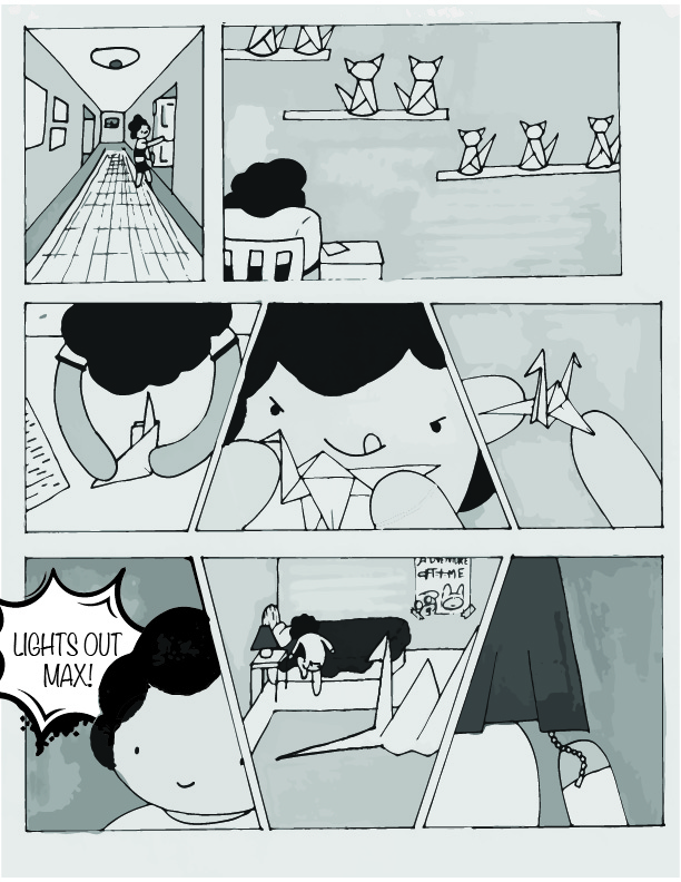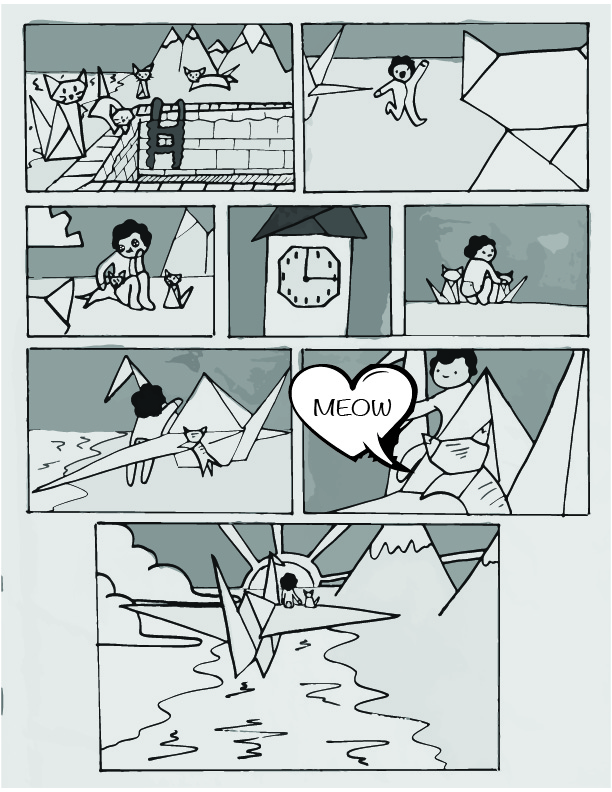 This project was a six page graphic novel that a group of classmates and I worked on for class. It follows Max, a young boy who desperately wants a cat. At night, he folds an origami crane that takes him to Origami Land, which is filled with origami cats. One cat comes with Max back to his home, and it turns into a real cat while Max is sleeping.
